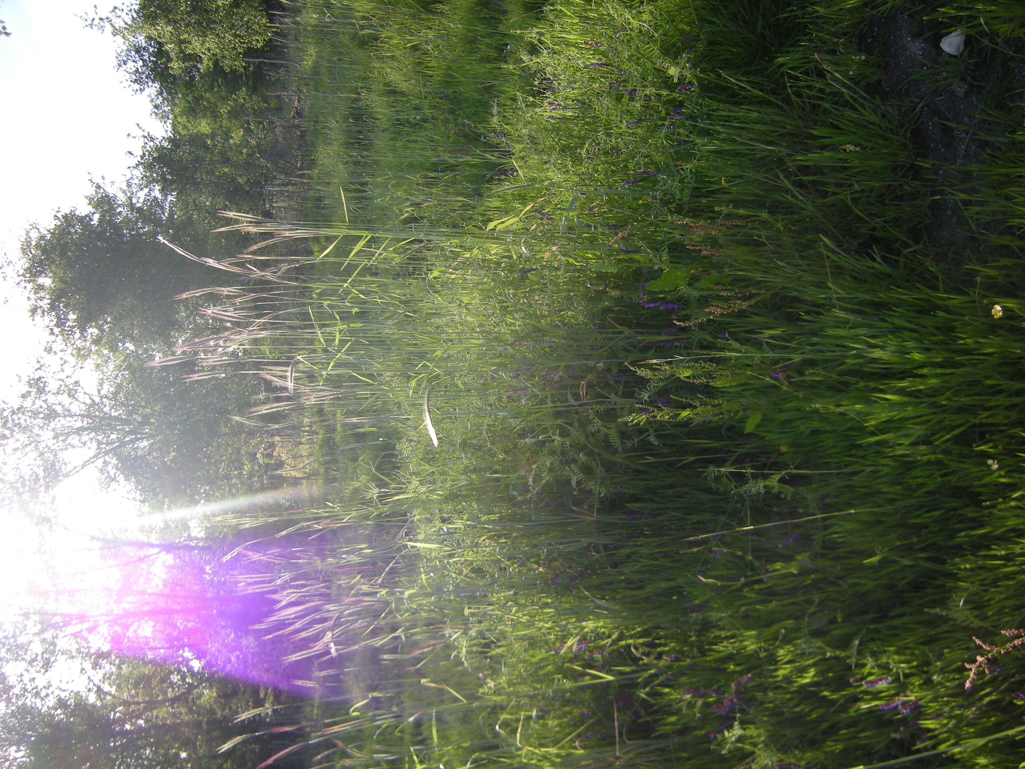 Sur la gauche, nous voyons un rumex qui pousse en synergie de notre chicorée en train de monter à graine & sur la droite, les feuilles si caractéristiques d'un jonc, vestige de l'état antérieur hydromorphe de la parcelle. Les pluies abondantes de ce printemps le firent ressurgir pour un temps le jonc. Il dominait, écrasait toute autre présence au temps où le sol était une éponge gorgée d'acide doux aux allures de tourbe noire l'hiver, grise l'été. Désormais dominé, il n'existe plus que par le support que lui offrent les deux autres plantes & ne pourra pas revenir aux années à pluviométrie normale : seules des pluies d'exception le font apparaître pour un temps. Les plantes vestiges d'époques antérieures peuvent se manifester des millénaires après que leur biotope ait été modifié avec le changement des populations & espèces présentes, des conditions de la chimie & la physique du lieu & des données du micro-climat considéré.