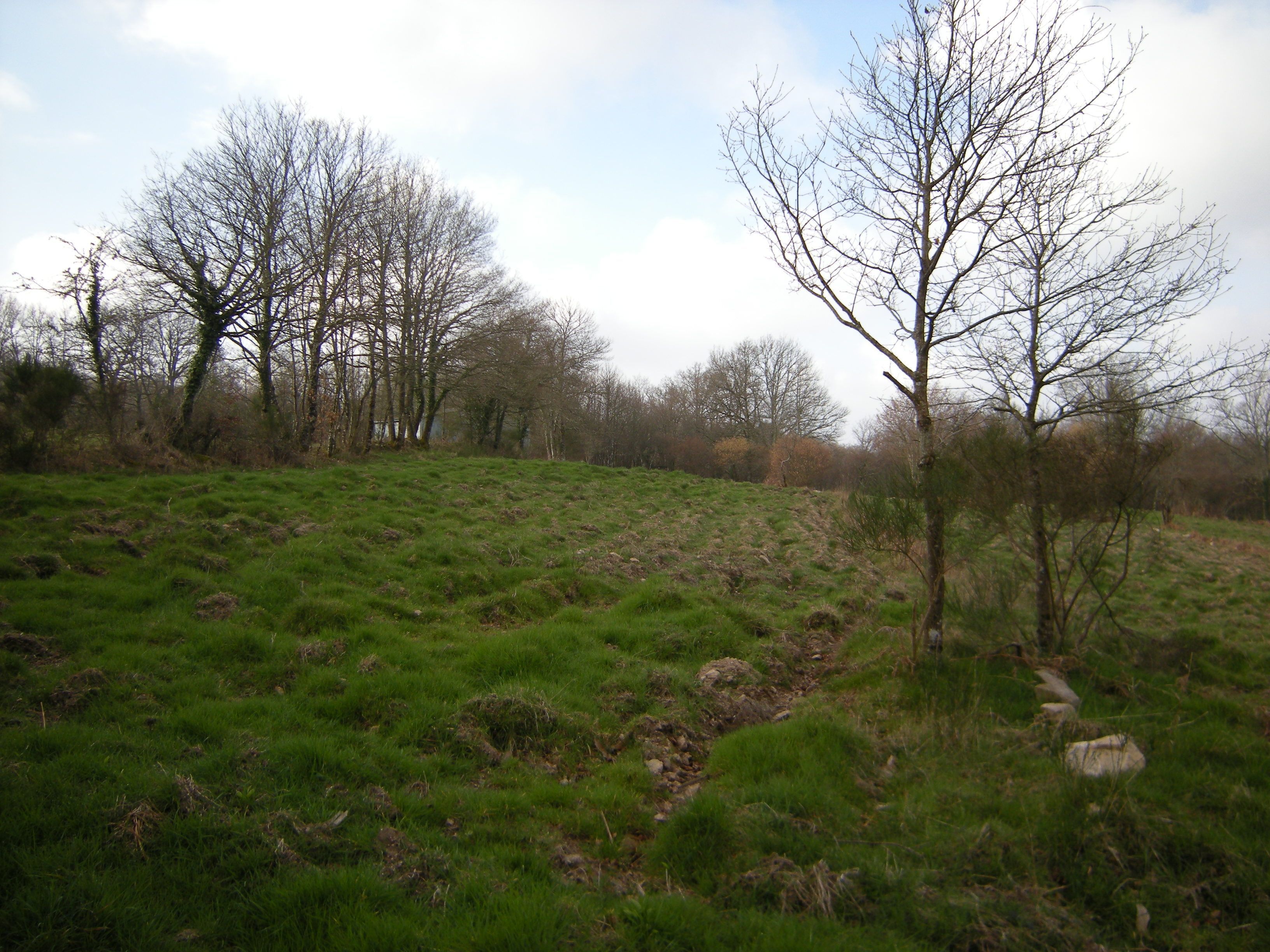 Nous voyons ici en un avril pluvieux l'eau de la parcelle sourdre à travers la berge vers le ru reconstitué. La parcelle se ressuie lentement depuis sa nappe vers le le ru, de l'eau reçue en pluies les jours précédents & que la végétation n'est pas capable d'utiliser en totalité en ce printemps un peu frais. C'est pourquoi nous parlons de drainage d'irrigation de pédogenèse - didp - car l'eau en cette configuration est utilisée à l'optimum de ce que la nature sait faire : nulle goutte n'en est perdue. Le bocage & les tsp offrent de ce fait - comme les paddies des rizières irriguées par intermittence - un optimum de productivité agronomique en climat tempéré. Il fut inventé il y a plus de cinq mille ans & couvrait alors la totalité de l'Europe. Les tsp se constituent lorsque leurs habitants paysans & jardiniers appliquent la discipline consistant à circuler sur les bords des parcelles établis selon des courbes de niveau afin de réduire l'effet d'érosion autant qu'il est possible. Au fil des ans, ces limites deviennent les bordures des terrasses.